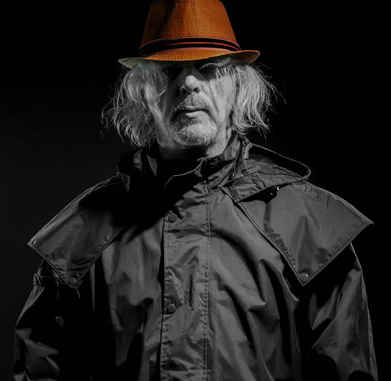 Een grijzende kerel met een wilde haardos,